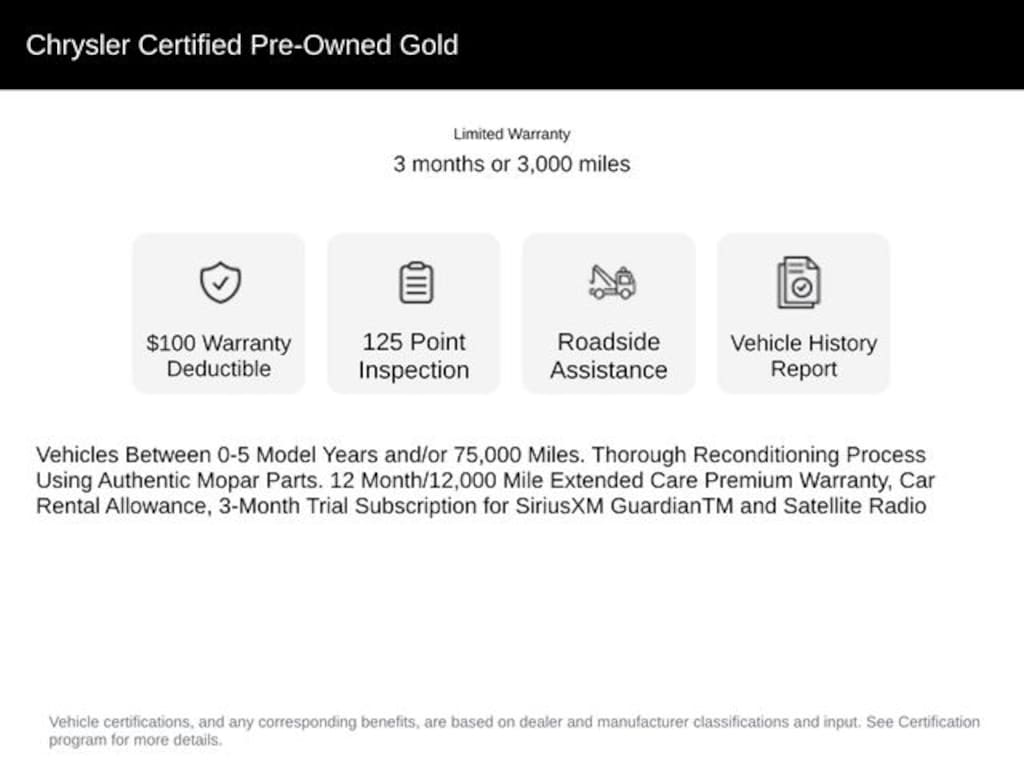 * Vehicles Between 0-5 Model Years and/or 75,000 Miles. Thorough Reconditioning Process Using Authentic Mopar Parts. 12 Month/12,000 Mile Extended Care Premium Warranty, Car Rental Allowance, 3-Month Trial Subscription for SiriusXM GuardianTM and Satellite Radio